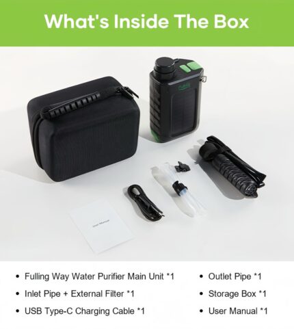 - [Fast and Long Endurance] Ultra fast purified water flow of 700ml (23 oz.) per minute.Built in large capacity lithium battery, one charge can purify 168000ml(5681 oz.) of water, enough for 10-to-15-day backpacking and multiple people to use at the same time.It can be powered in multiple ways: mobile power supply, solar panel, vehicle power supply etc.