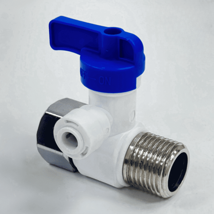 LEAD FREE: Angle shutoff valve features a white polypropylene body with EPDM seals, and has lead-free brass threads for long-lasting reliability