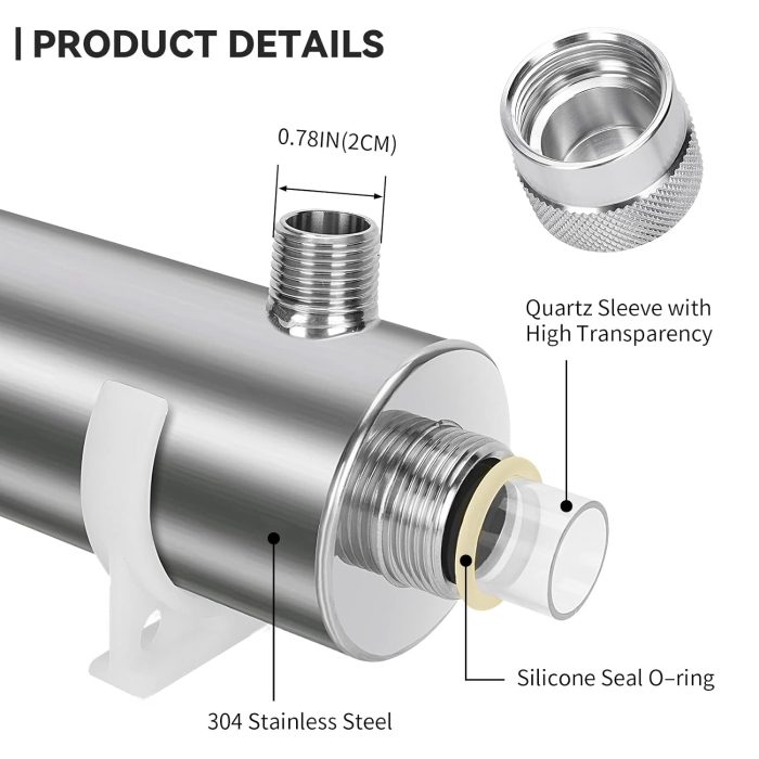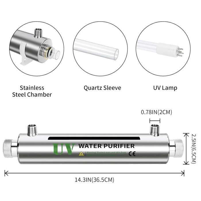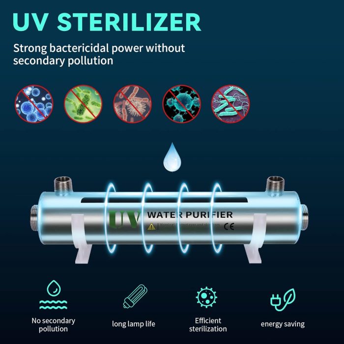 - Cost-effective: This UV water purification system requires only the UV lamp and quartz sleeve to be replaced each year, resulting in lower maintenance costs. Efficient sterilization, sterilizing 99.99% of bacteria and viruses, producing pure water for your entire family.